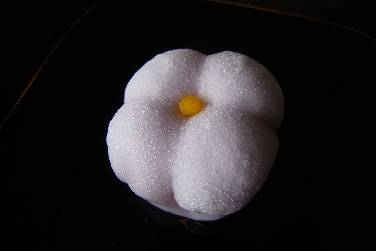 ↓ 羽二重の「四葩」。羽二重は、米粉と砂糖と水飴。泡立てた卵白(メレンゲ)も入っていると聞いたことがある。